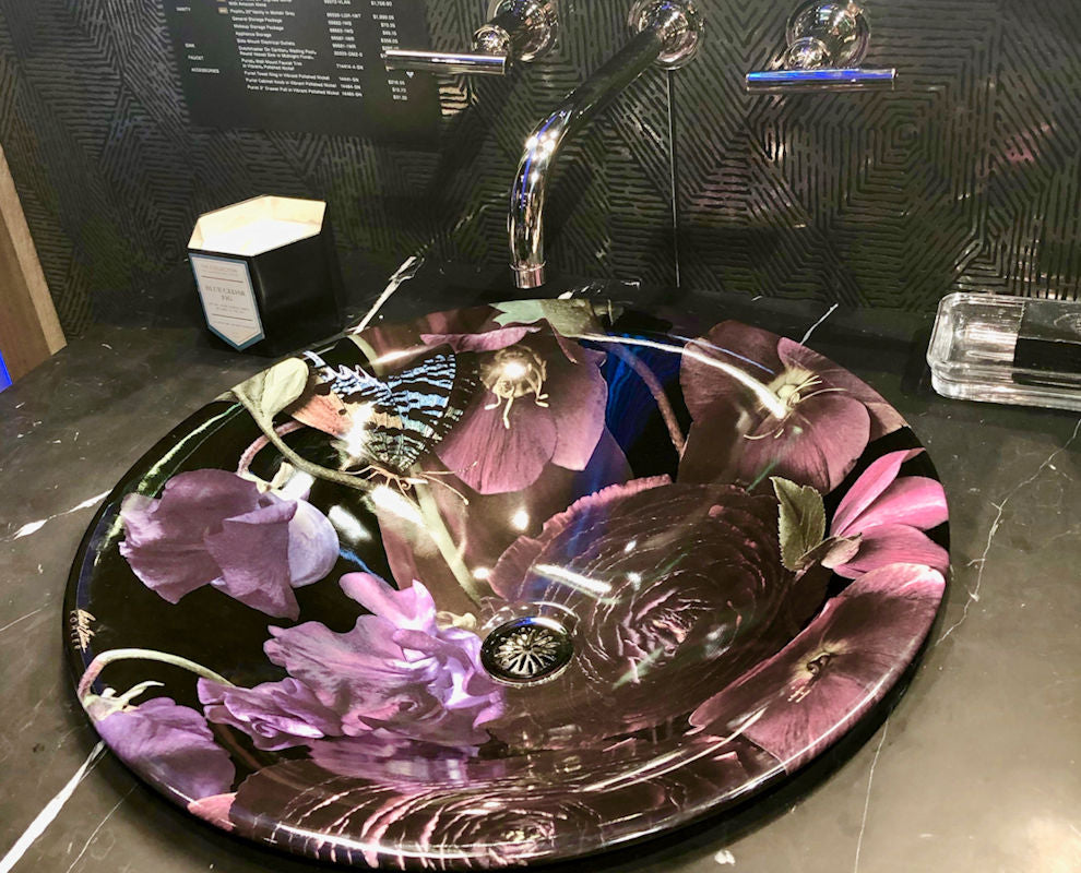 Art has entered the bathroom in the most lush, dramatic way! Introducing the Dutchmaster Collection, the latest collection of Artist Edition basins inspired by the Dutch Masters of the 17th century. Big, bold. lush florals, dramatically enhanced by a deeply dark, moody background, adorn the entire surface of the basin's interior. Available in Midnight Floral and Blush Floral in either rectangle or round. NOTE: waste shown is not included and must be purchased separately.